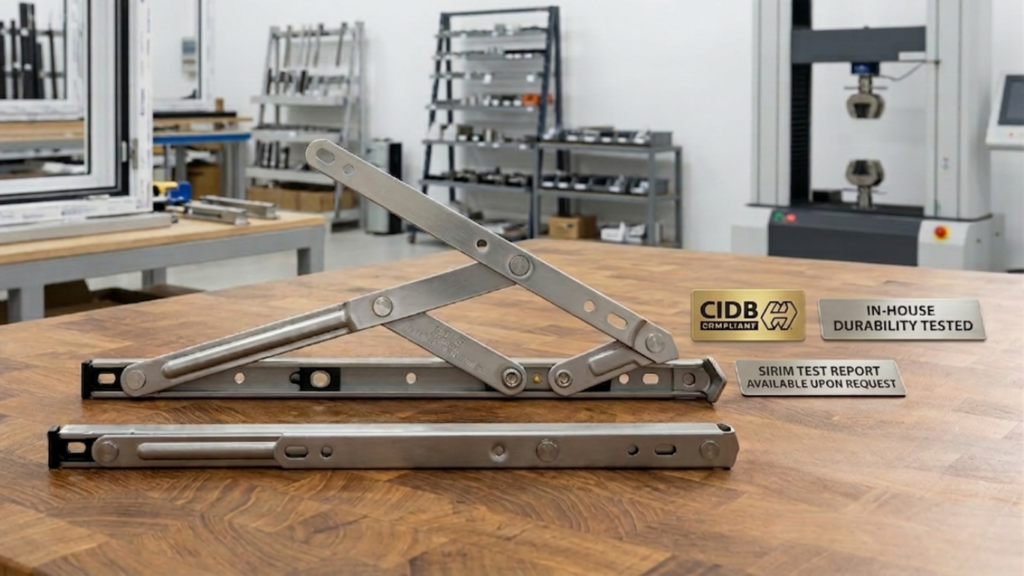At SEMS, we don’t just manufacture, we master. Our window stays are fully compliant with CIDB specifications and backed by comprehensive SIRIM test reports, ensuring every unit meets the highest industrial standards. With our advanced in-house durability testing facility, we rigorously cycle-test our products to guarantee peak performance and structural integrity that lasts a lifetime.